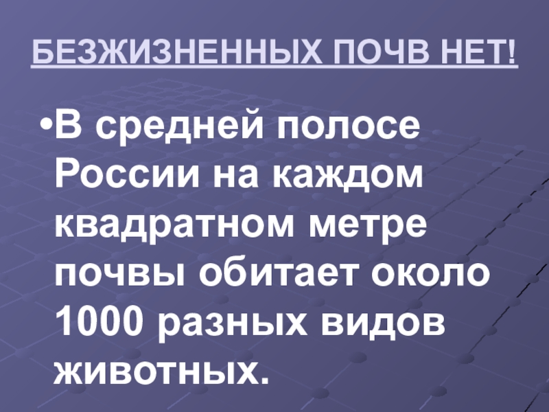 БЕЗЖИЗНЕННЫХ ПОЧВ НЕТ!В средней полосе России на каждом квадратном метре почвы обитает около 1000 разных видов животных.