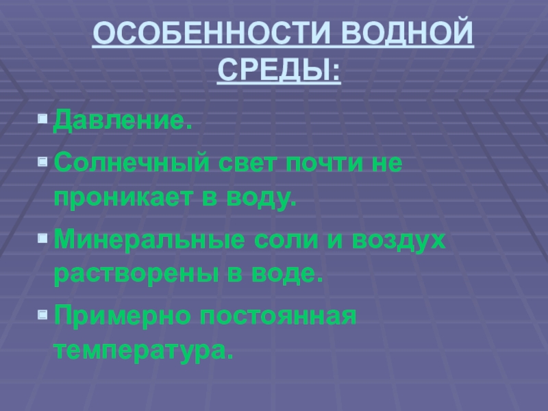 ОСОБЕННОСТИ ВОДНОЙ СРЕДЫ:Давление.Солнечный свет почти не проникает в воду.Минеральные соли и воздух растворены в воде.Примерно постоянная