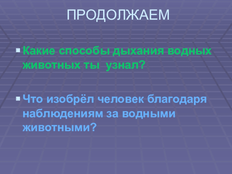 ПРОДОЛЖАЕМКакие способы дыхания водных животных ты узнал?Что изобрёл человек благодаря наблюдениям за водными животными?