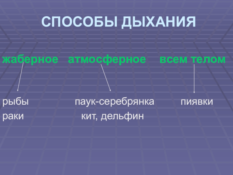 СПОСОБЫ ДЫХАНИЯ жаберное  атмосферное  всем телом