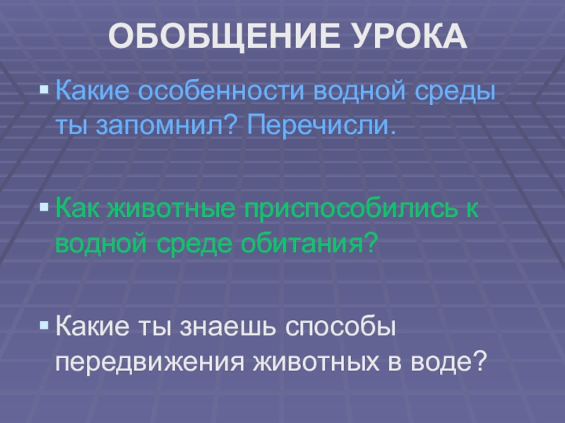 ОБОБЩЕНИЕ УРОКАКакие особенности водной среды ты запомнил? Перечисли.Как животные приспособились к водной среде обитания?Какие ты знаешь способы