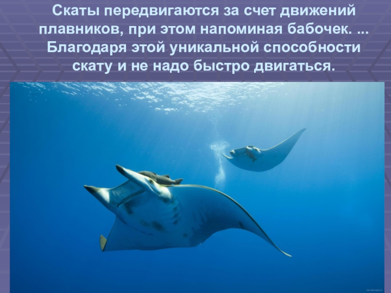 Слайд 9Скаты передвигаются за счет движений плавников, при этом напоминая бабочек. ...