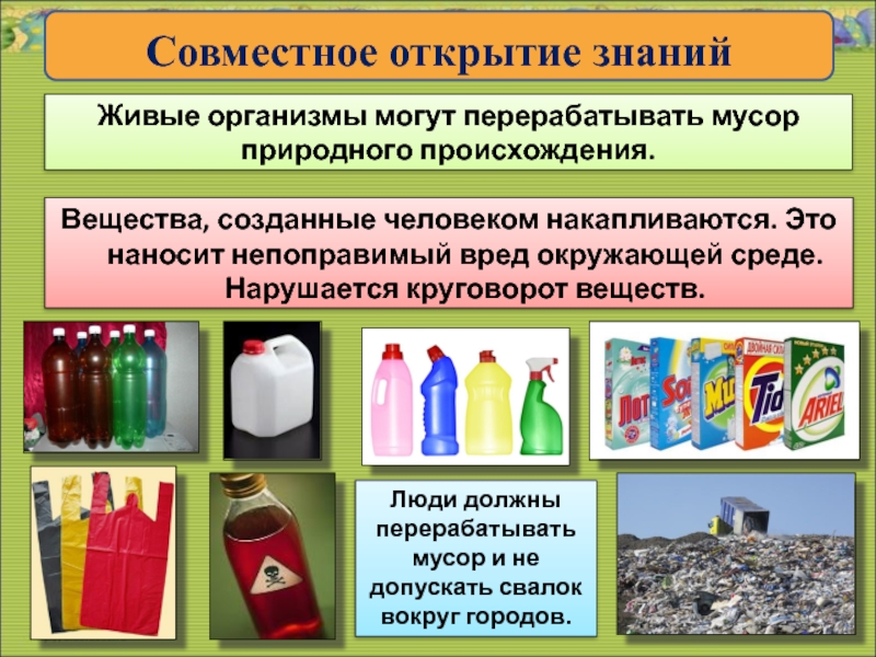 Люди должны перерабатывать мусор и не допускать свалок вокруг городов.
