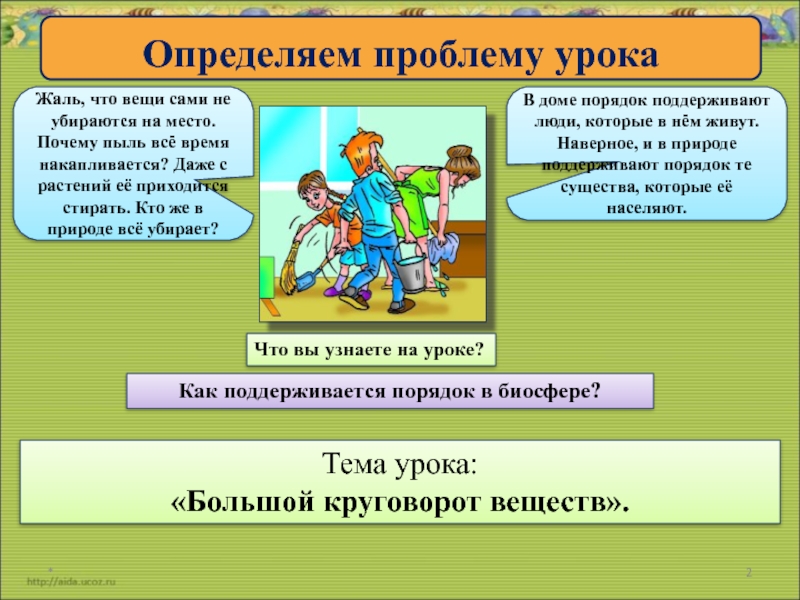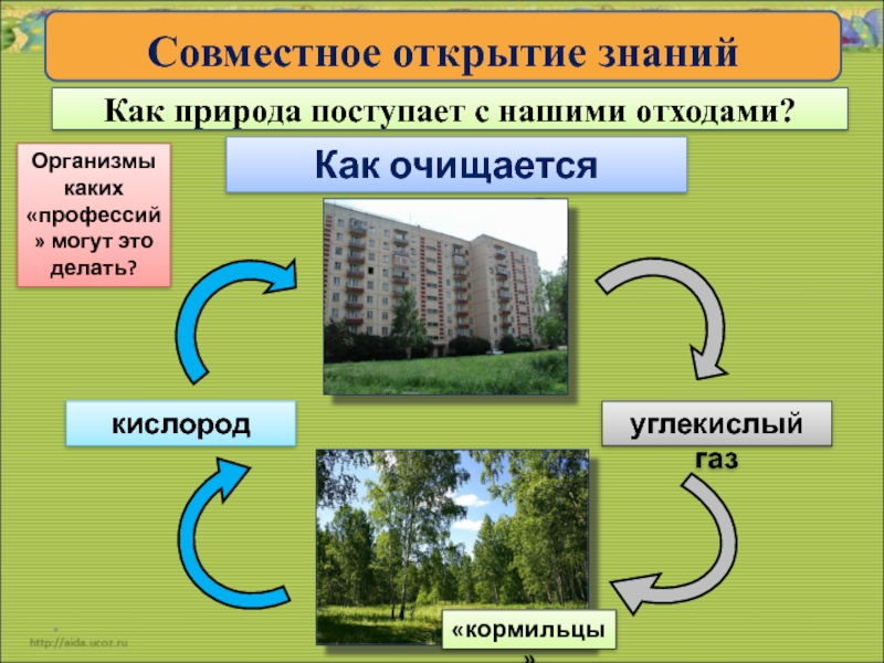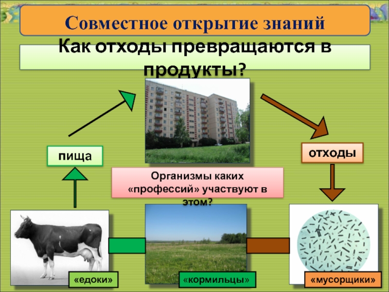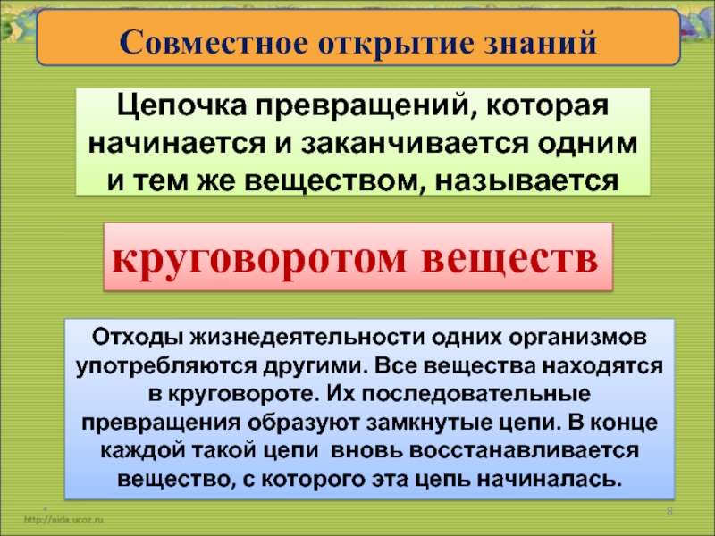 Отходы жизнедеятельности одних организмов употребляются другими. Все вещества находятся в круговороте. Их последовательные превращения образуют замкнутые цепи. В конце каждой такой цепи вновь восстанавливается вещество, с которого эта цепь начиналась.