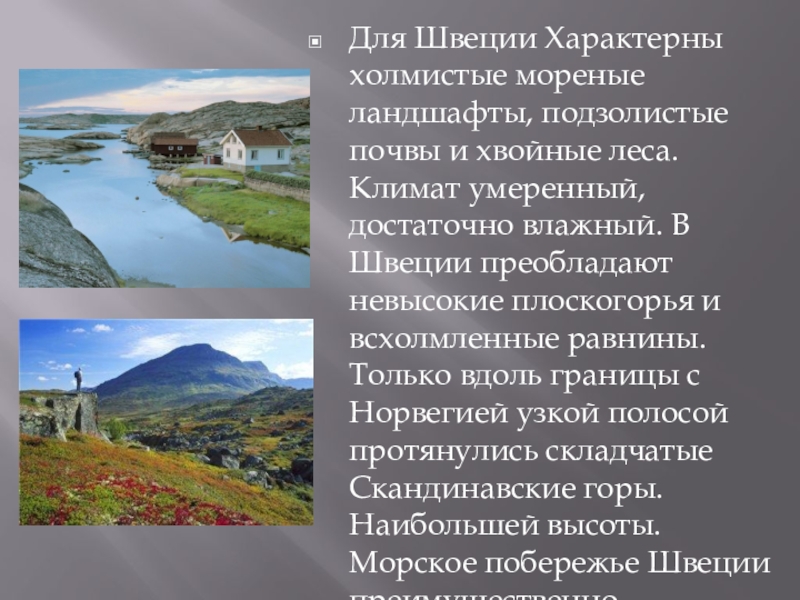 Климат умеренный, достаточно влажный. В Швеции преобладают невысокие плоскогорья и всхолмленные равнины. Только вдоль границы с Норвегией узкой полосой протянулись складчатые Скандинавские горы. Наибольшей высоты. Морское побережье Швеции преимущественно низменное.