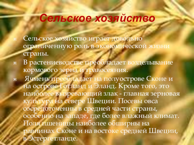 Ячмень преобладает на полуострове Сконе и на острове Готланд и Эланд. Кроме того, это наиболее вызревающий злак - главная зерновая культура на севере Швеции. Посевы овса сосредоточенны в средней части страны, особенно на западе, где более влажный климат. Поля пшеницы наиболее обширны на равнинах Сконе и на востоке средней Швеции, в Эстергетланде.