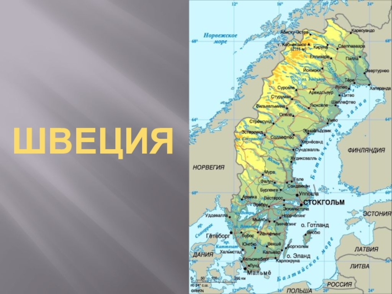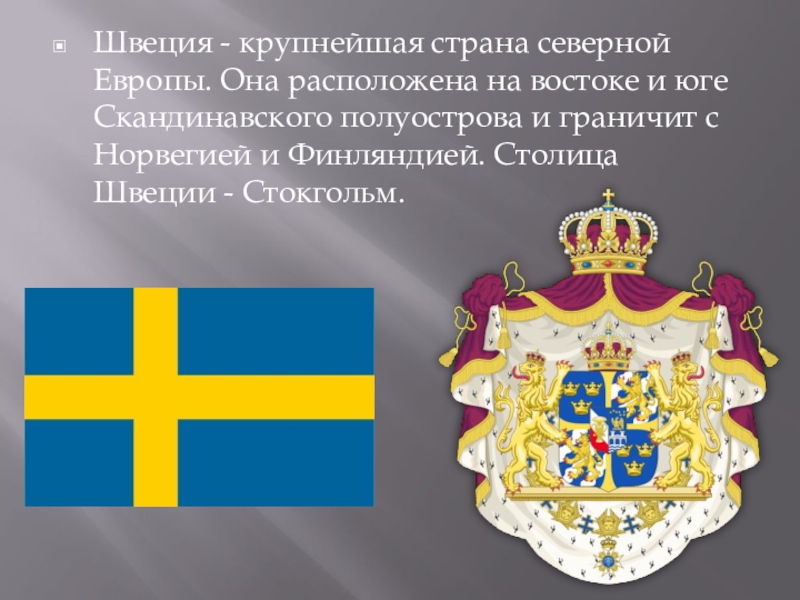 юге Скандинавского полуострова и граничит с Норвегией и Финляндией. Столица Швеции - Стокгольм.
