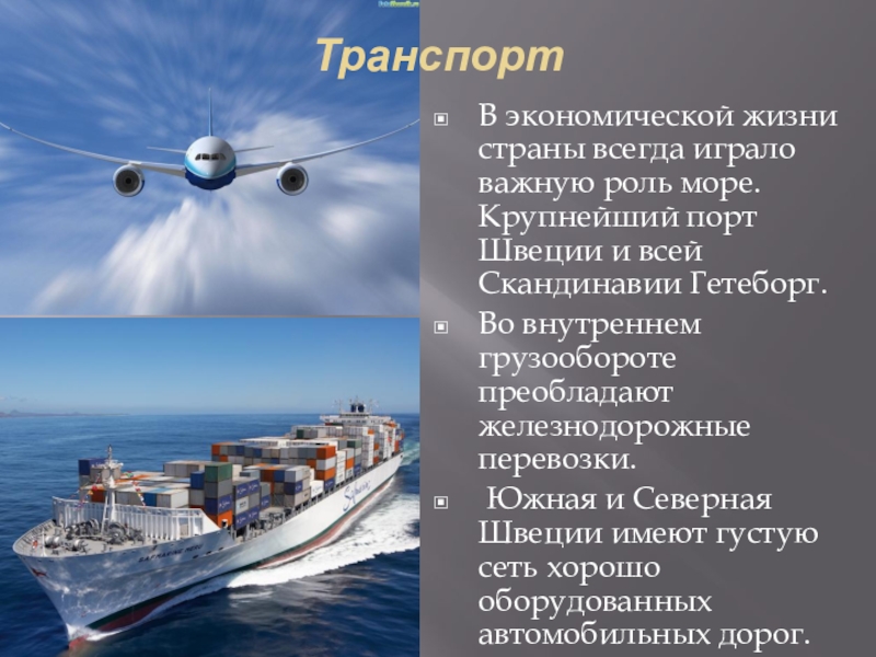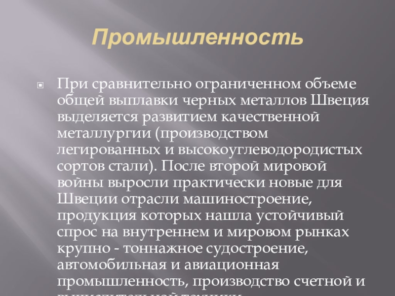 качественной металлургии (производством легированных и высокоуглеводородистых сортов стали). После второй мировой войны выросли практически новые для Швеции отрасли машиностроение, продукция которых нашла устойчивый спрос на внутреннем и мировом рынках крупно - тоннажное судостроение, автомобильная и авиационная промышленность, производство счетной и вычислительной техники.