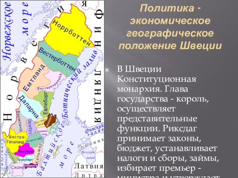 - король, осуществляет представительные функции. Риксдаг принимает законы, бюджет, устанавливает налоги и сборы, займы, избирает премьер - министра и утверждает состав правительства и т.д.