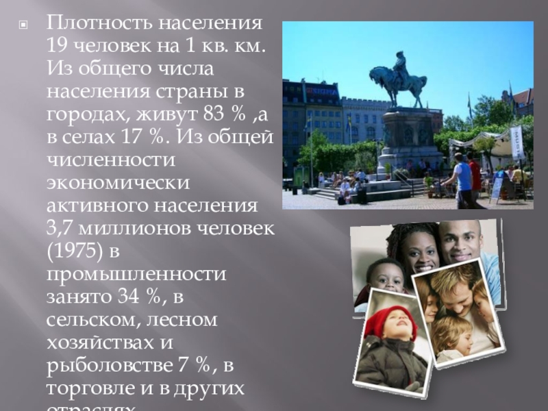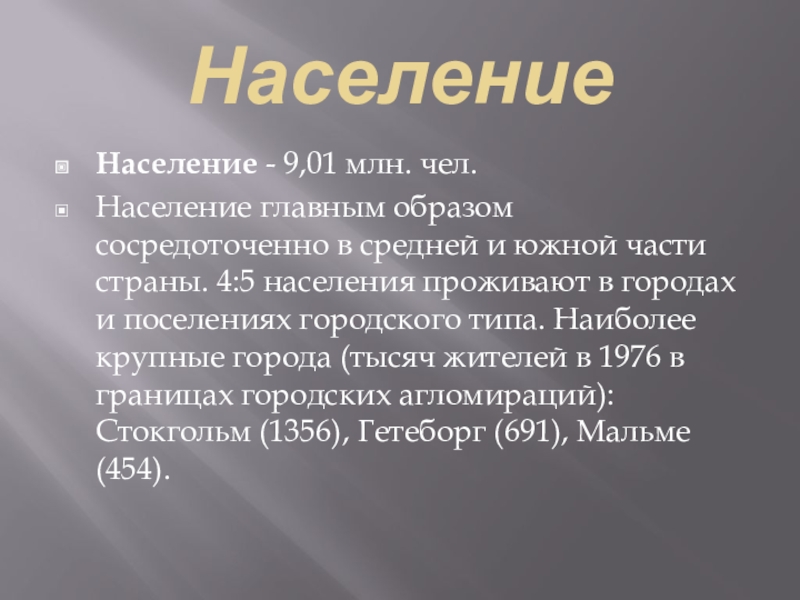 части страны. 4:5 населения проживают в городах и поселениях городского типа. Наиболее крупные города (тысяч жителей в 1976 в границах городских агломираций): Стокгольм (1356), Гетеборг (691), Мальме (454).