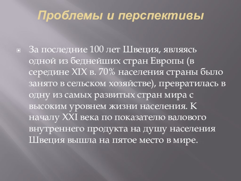 стран Европы (в середине XIX в. 70% населения страны было занято в сельском хозяйстве), превратилась в одну из самых развитых стран мира с высоким уровнем жизни населения. К началу XXI века по показателю валового внутреннего продукта на душу населения Швеция вышла на пятое место в мире.