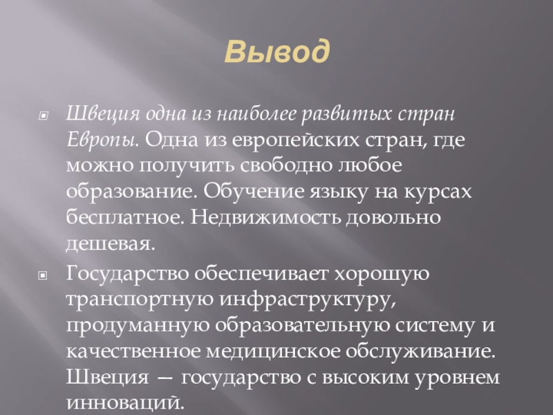 Швеция одна из наиболее развитых стран Европы. Одна из европейских стран,