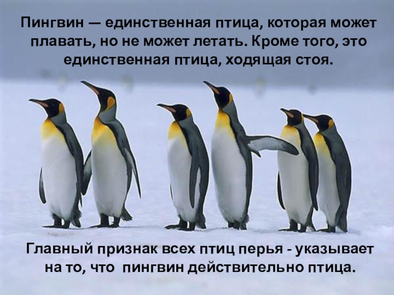 Главный признак всех птиц перья - указывает на то, что пингвин действительно птица.