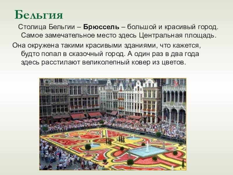Бельгия  Столица Бельгии – Брюссель – большой и красивый город. Самое замечательное место здесь Центральная площадь.