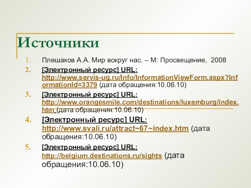 ИсточникиПлешаков А.А. Мир вокруг нас. – М: Просвещение, 2008[Электронный ресурс] URL: http://www.servis-ug.ru/Info/InformationViewForm.aspx?InformationId=3379 (дата обращения:10.06.10)[Электронный ресурс] URL: http://www.orangesmile.com/destinations/luxemburg/index.htm