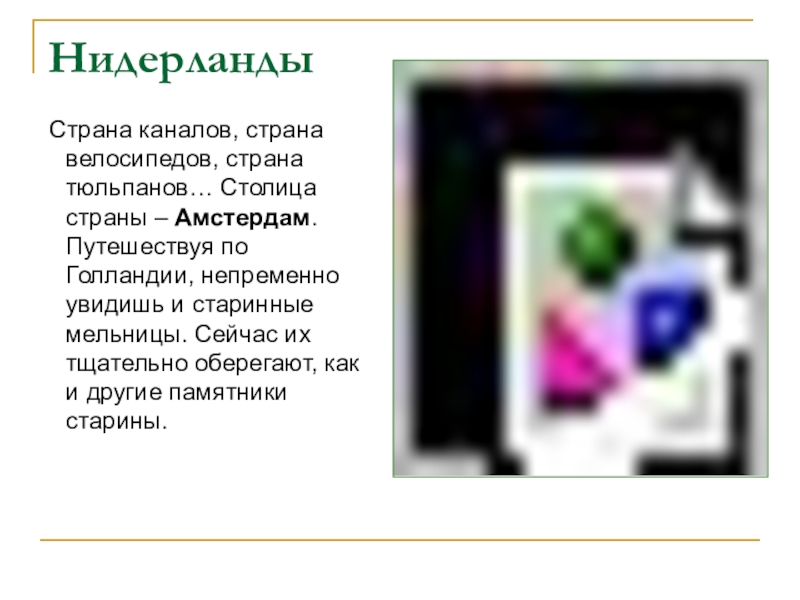 Нидерланды Страна каналов, страна велосипедов, страна тюльпанов… Столица страны – Амстердам. Путешествуя по Голландии, непременно увидишь и