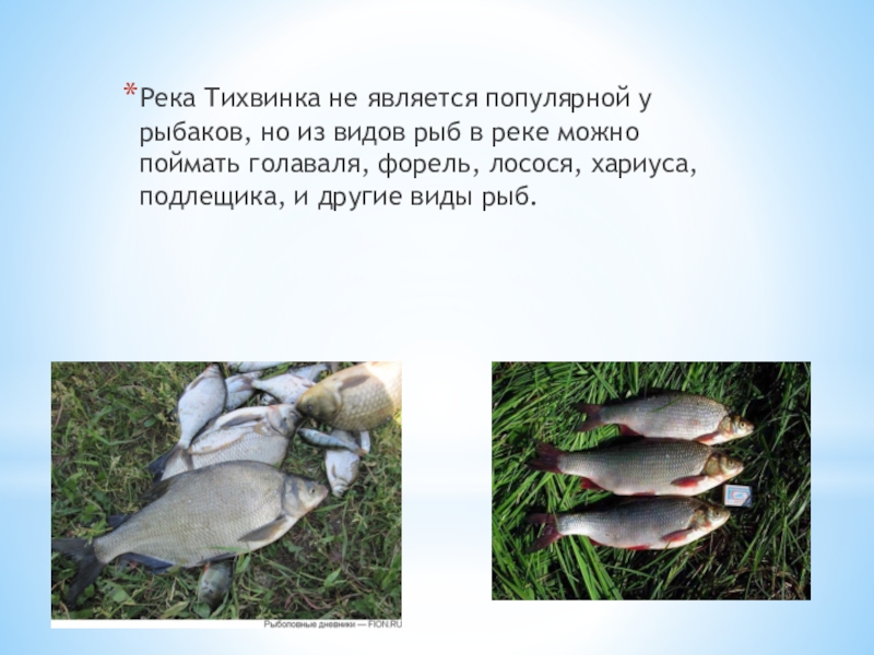Слайд 18Река Тихвинка не является популярной у рыбаков, но из видов рыб