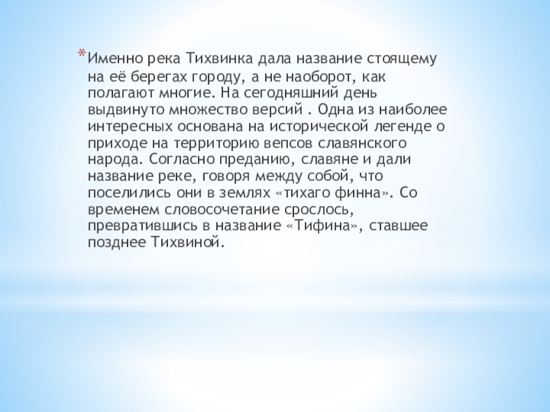 не наоборот, как полагают многие. На сегодняшний день выдвинуто множество версий . Одна из наиболее интересных основана на исторической легенде о приходе на территорию вепсов славянского народа. Согласно преданию, славяне и дали название реке, говоря между собой, что поселились они в землях «тихаго финна». Со временем словосочетание срослось, превратившись в название «Тифина», ставшее позднее Тихвиной.