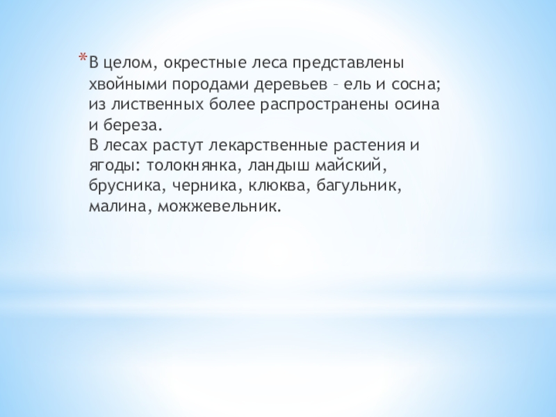 Слайд 15В целом, окрестные леса представлены хвойными породами деревьев – ель и