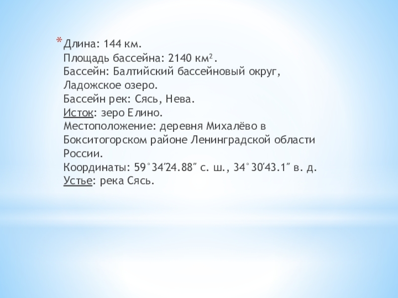 озера Еглино и несёт свои воды к устью на протяжении 144 км. Вливается в Сясь с правой стороны, на 96 км. Река входит в состав Тихвинской водной системы, практически не действующей на сегодняшний день.