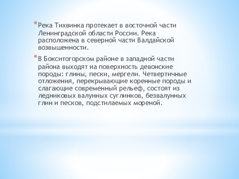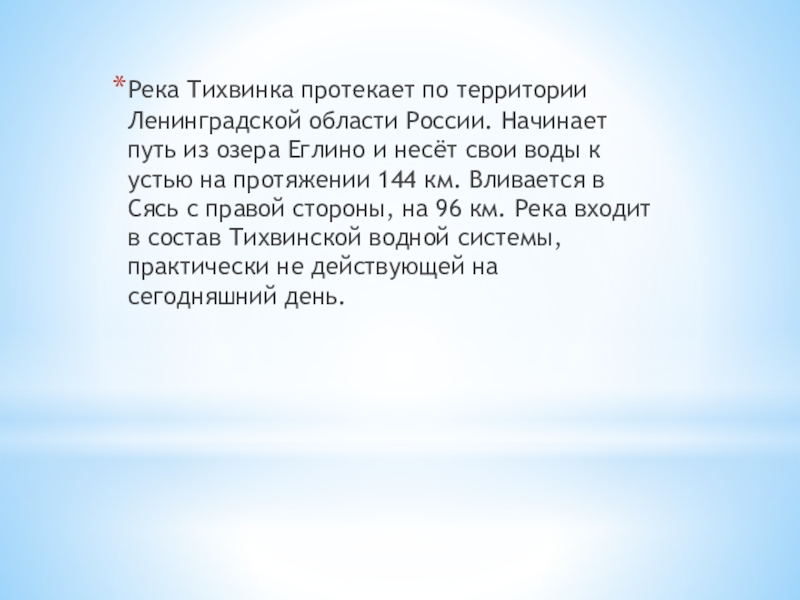 Слайд 9Река Тихвинка протекает в восточной части Ленинградской области России. Река расположена