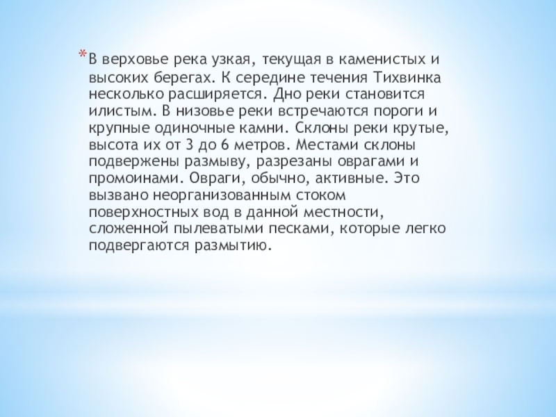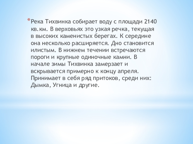 Слайд 7Река Тихвинка собирает воду с площади 2140 кв.км. В верховьях это