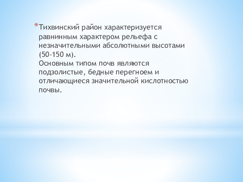 Слайд 11Тихвинский район характеризуется равнинным характером рельефа с незначительными абсолютными высотами (50-150