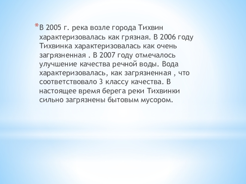 Слайд 19В 2005 г. река возле города Тихвин характеризовалась как грязная. В