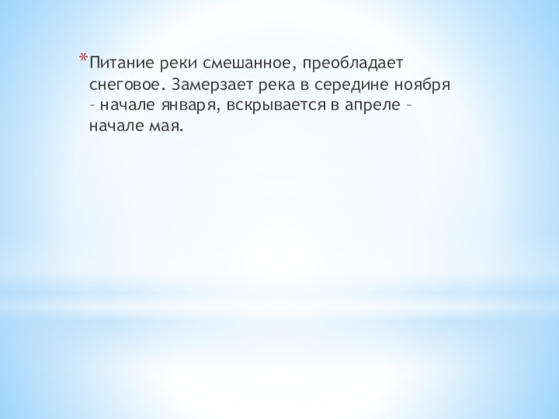Слайд 13Питание реки смешанное, преобладает снеговое. Замерзает река в середине ноября –