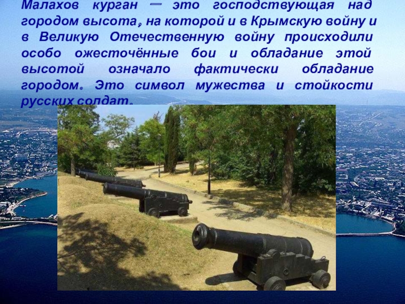 Слайд 8Малахов курган — это господствующая над городом высота, на которой и