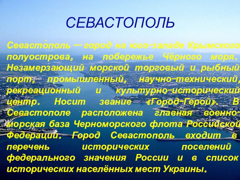 Севасто́поль — город на юго-западе Крымского полуострова, на побережье Чёрного моря.