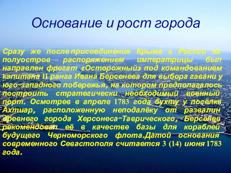 распоряжением императрицы был направлен фрегат «Осторожный» под командованием капитана II ранга Ивана Берсенева для выбора гавани у юго-западного побережья, на котором предполагалось построить стратегически необходимый военный порт. Осмотрев в апреле 1783 года бухту у посёлка Ахтиар, расположенную неподалёку от развалин древнего города Херсонеса-Таврического, Берсенев рекомендовал её в качестве базы для кораблей будущего Черноморского флота.Датой основания современного Севастополя считается 3 (14) июня 1783 года.