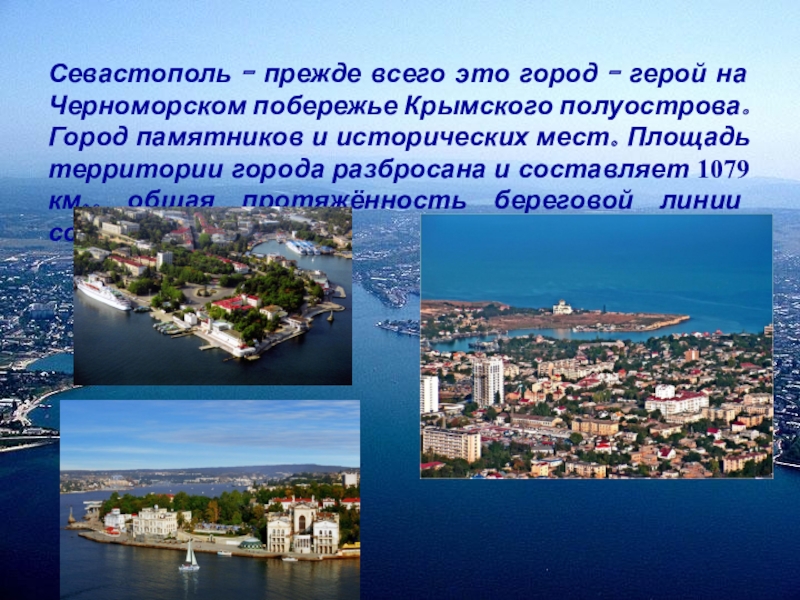 Крымского полуострова. Город памятников и исторических мест. Площадь территории города разбросана и составляет 1079 км., общая протяжённость береговой линии составляет 152 км.