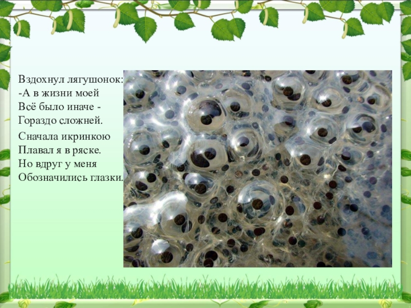 Вздохнул лягушонок: -А в жизни моей Всё было иначе - Гораздо сложней.Сначала икринкою Плавал я в ряске.
