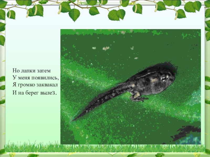 Но лапки затем У меня появились, Я громко заквакал И на берег вылез.