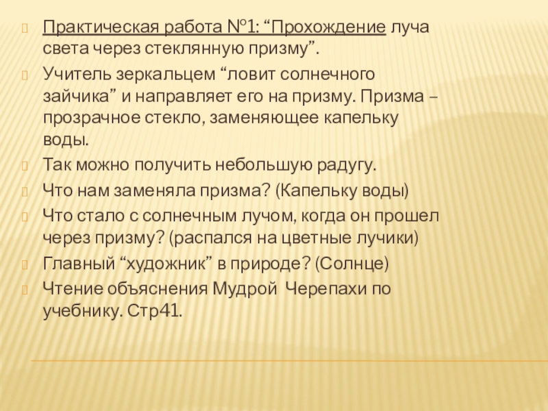 “ловит солнечного зайчика” и направляет его на призму. Призма – прозрачное стекло, заменяющее капельку воды.