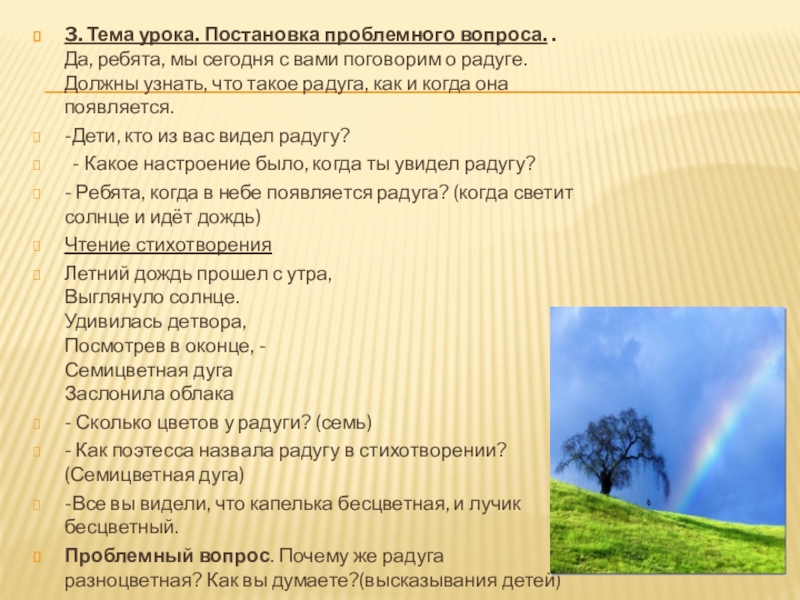 с вами поговорим о радуге. Должны узнать, что такое радуга, как и когда она появляется.