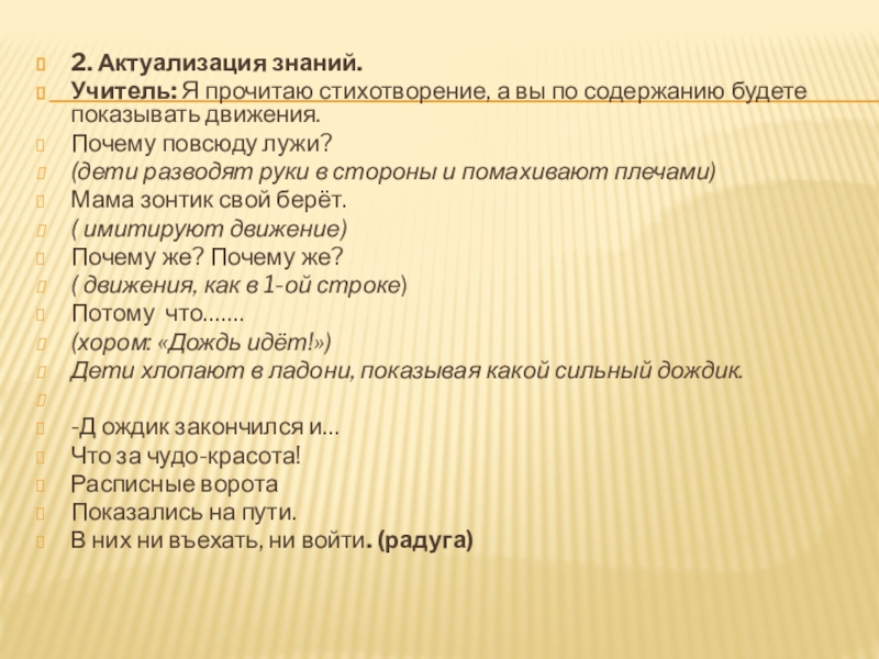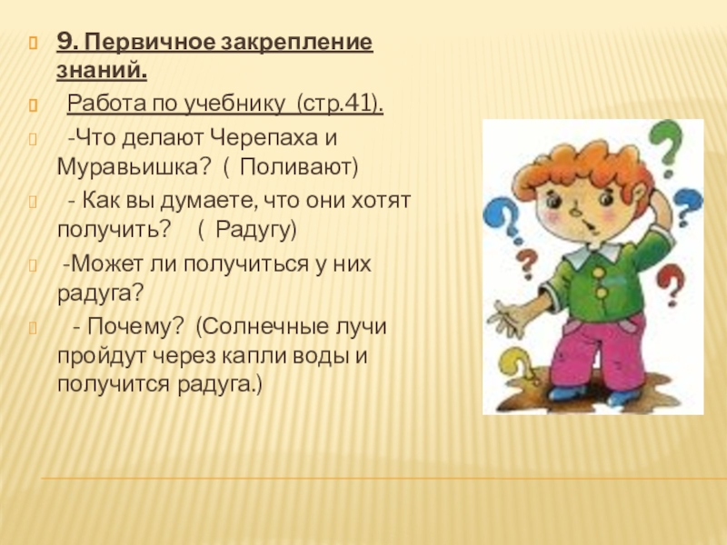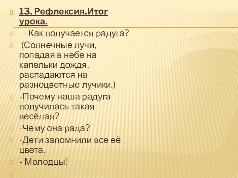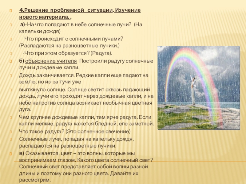 б) объяснение учителя Построили радугу солнечные лучи и дождевые капли.