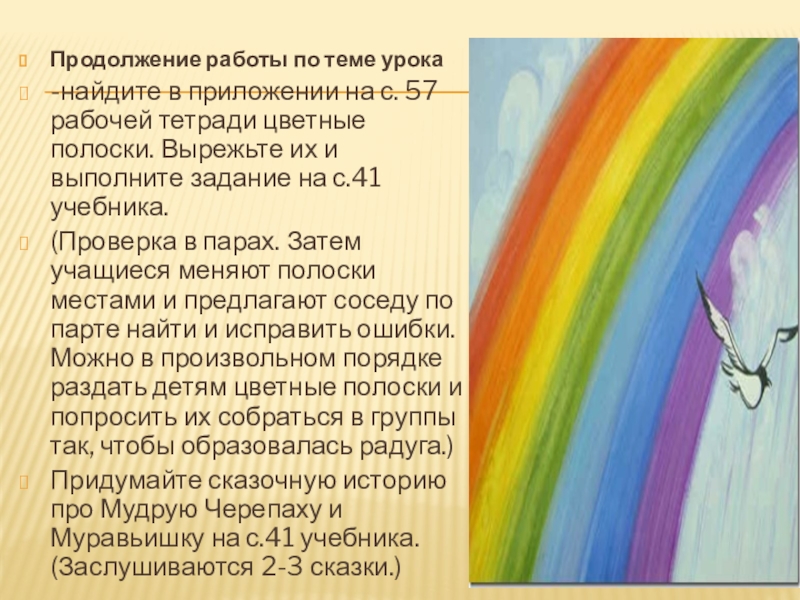 - работать в паре: отображать последовательность цветов радуги с помощью цветных полосок, осуществлять взаимопроверку.