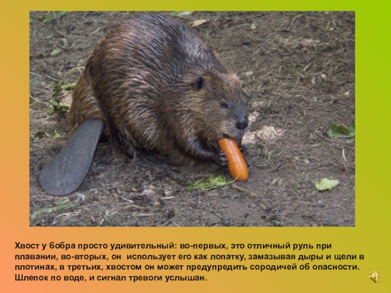 Слайд 15Хвост у бобра просто удивительный: во-первых, это отличный руль при плавании,