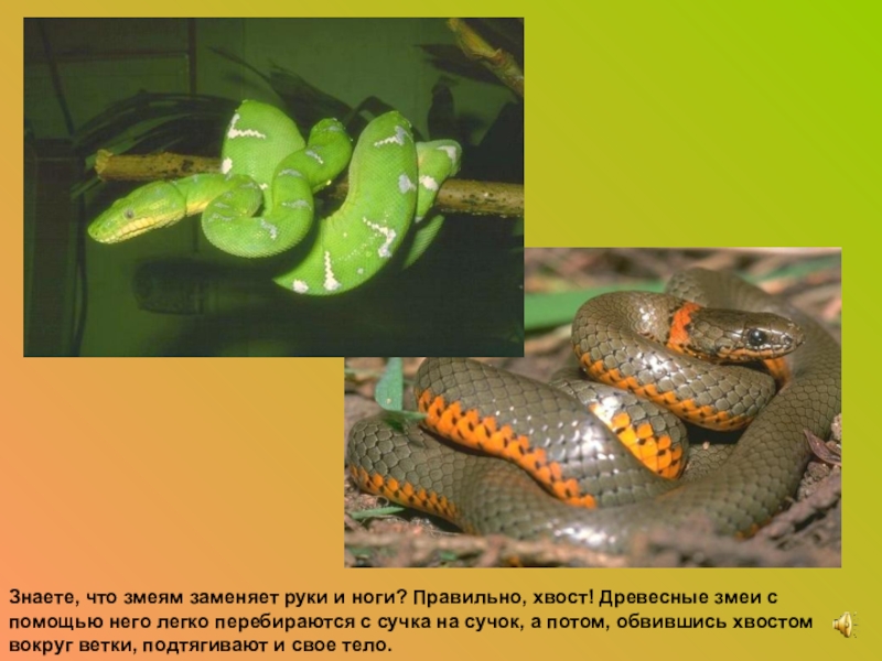 Слайд 11Знаете, что змеям заменяет руки и ноги? Правильно, хвост! Древесные змеи