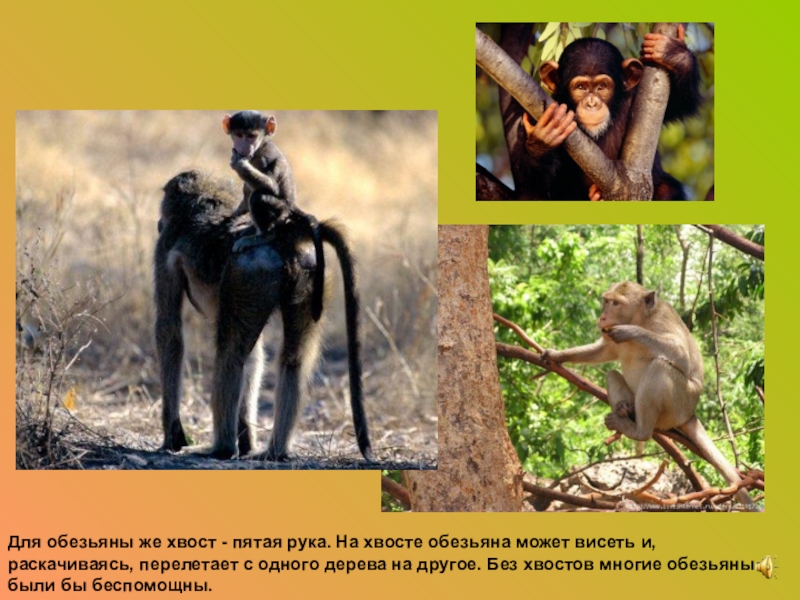 Слайд 16Для обезьяны же хвост - пятая рука. На хвосте обезьяна может