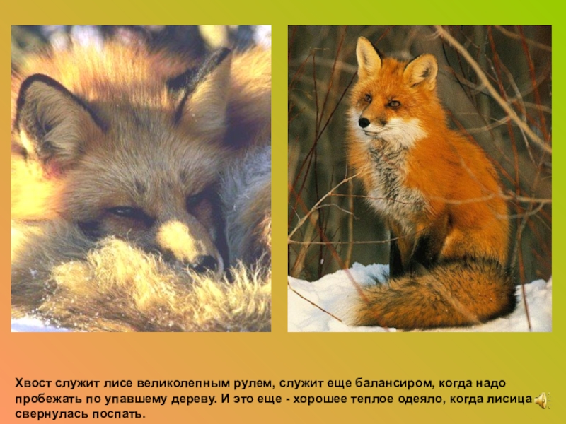 Слайд 5Хвост служит лисе великолепным рулем, служит еще балансиром, когда надо пробежать