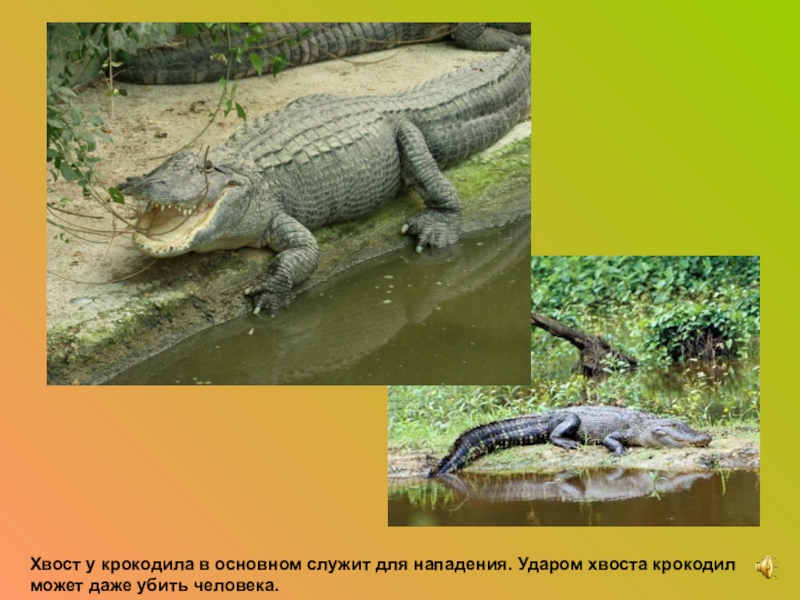 Слайд 14Хвост у крокодила в основном служит для нападения. Ударом хвоста крокодил