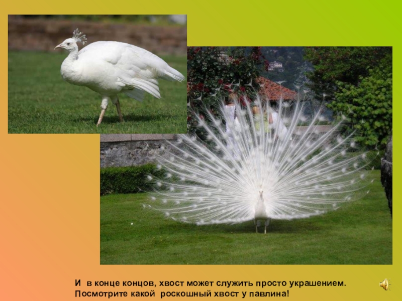И в конце концов, хвост может служить просто украшением. Посмотрите какой роскошный хвост у павлина!