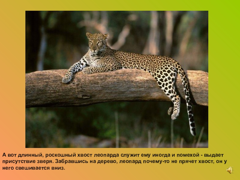 Слайд 13А вот длинный, роскошный хвост леопарда служит ему иногда и помехой