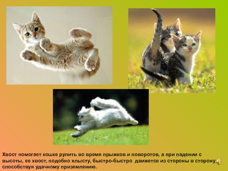 Хвост помогает кошке рулить во время прыжков и поворотов, а при падении с высоты, ее хвост, подобно