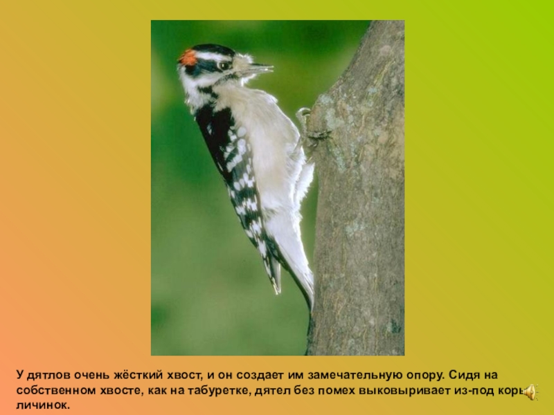 У дятлов очень жёсткий хвост, и он создает им замечательную опору. Сидя на собственном хвосте, как на
