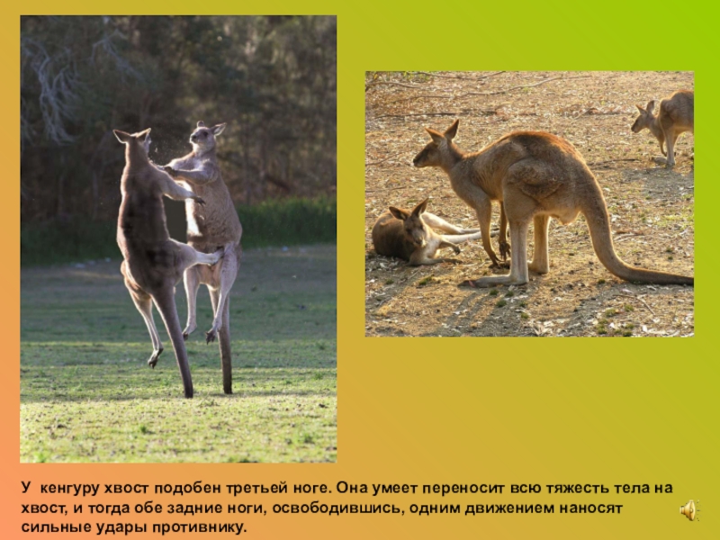 Слайд 17У кенгуру хвост подобен третьей ноге. Она умеет переносит всю тяжесть