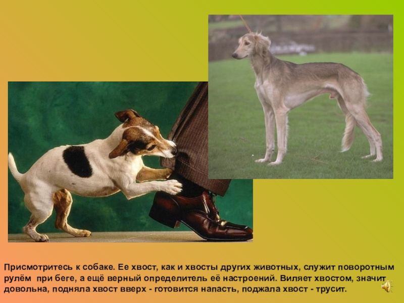 Слайд 3Присмотритесь к собаке. Ее хвост, как и хвосты других животных, служит